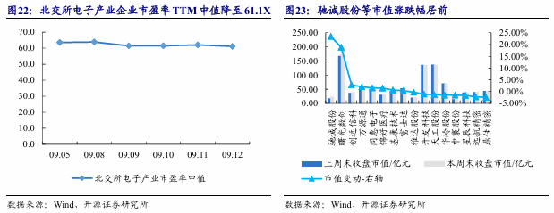 本周,从估值再现看,北交所电子财产市盈率TTM中值降至61.1X。从本周个股市值再现来看,驰诚股份+23.44%、曙光数创+18.81%、创远信科+2.85%布列市值涨跌幅前三甲。(电子公司种别:包括消费电子、医疗电子、新能源电子开发、仪器仪外等细分行业)