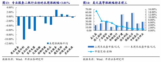 消费效劳行业本周市盈率中值降至61.0X,美之高+14.81%、邦义招标+7.29%、广咨邦际+6.79%涨跌幅排名前三。(消费效劳包括贸易效劳、包装印刷、食物饮料、家用电器、交通运输、动物保健、家居用品、专业效劳、修立装扮、境况管束、农林牧渔等二级行业)