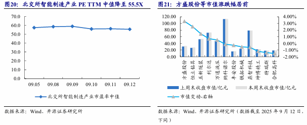 本周,从估值再现看,北交所智能制作财产市盈率TTM中值降至55.5X。从本周个股市值再现来看,方盛股份+3.33%、恒立钻具+2.53%、五新隧装+1.45%布列市值涨跌幅前三甲。(智能制作公司种别:包括死板开发、死板零件制作、军工制作、走运开发、电气开发等细分行业)